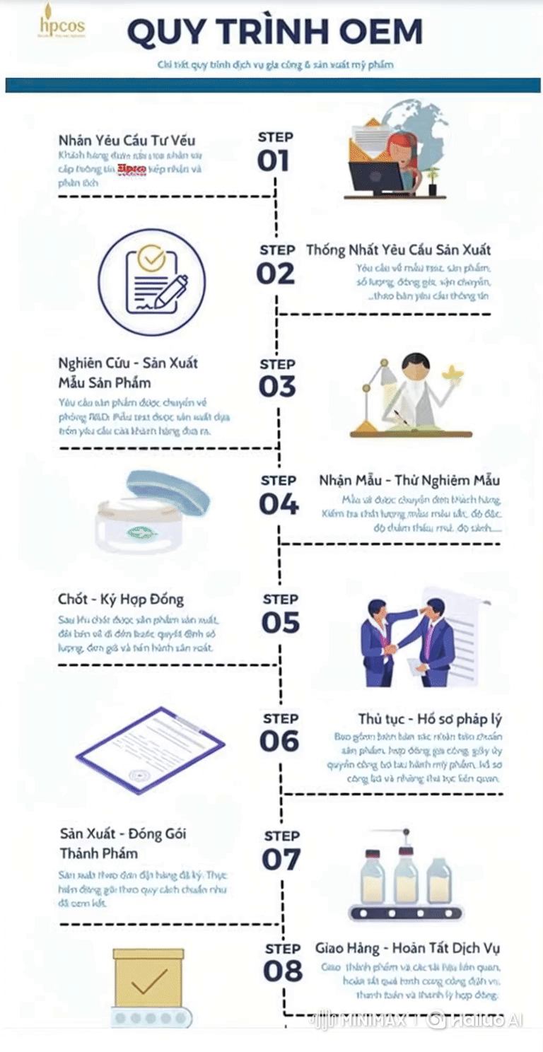 Sau khi khách hàng duyệt mẫu công thức và thiết kế, hai bên tiến hành ký hợp đồng sản xuất ODM chính thức. Hợp đồng quy định rõ công thức độc quyền, sản lượng, chi phí, thời gian giao hàng và quyền sở hữu thương hiệu.