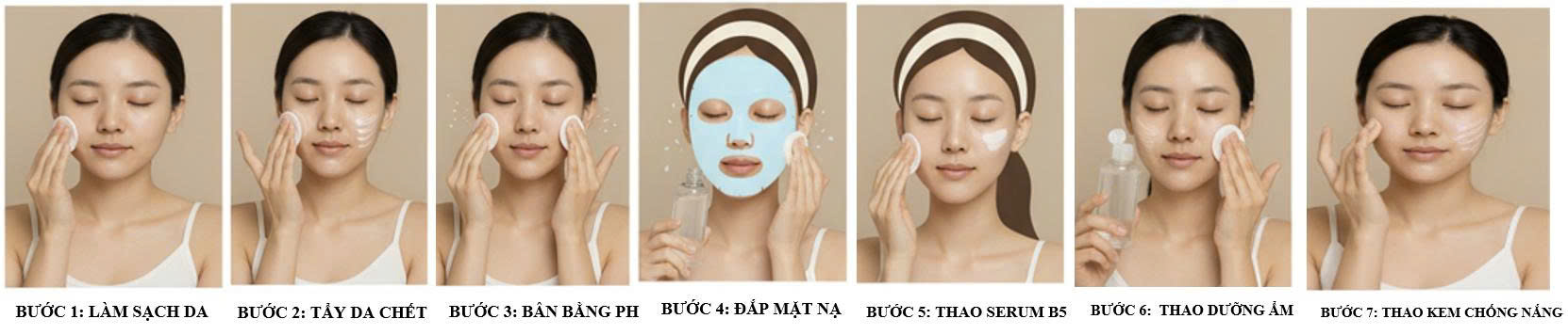 *Lưu ý: Bước 7 chỉ thực hiện vào khi chăm sóc da vào buổi sáng.